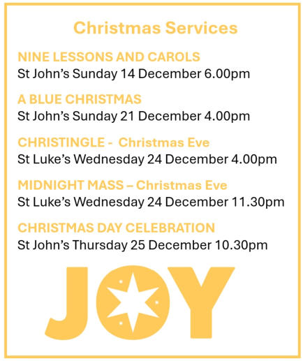Sunday 9 November in St Luke’s Church (Remembrance Sunday) 9.00am Children’s Church 10.00am Parish Eucharist 5.00pm BCP Evening Prayer with discussion – St John’s Midweek Service of the Word at St John’s this week Wednesday 9:15am followed by coffee Morning Prayer Tuesday, Wednesday & Thursday 8.00am St Luke’s Lady Chapel Evening Prayer Wednesdays 5.30pm St Luke’s Lady Chapel Sunday 16 November in St John’s Church 9.15am Morning Prayer 10.00am Parish Eucharist 6:30pm Joint Evening Service @Lancaster Road URC