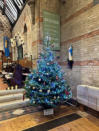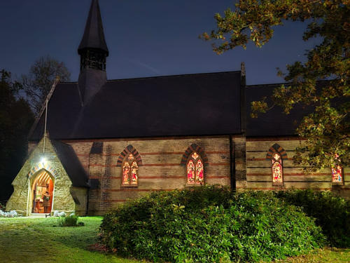 St John the Baptist built in 1857. It is a small Gothic building designed by J Piers St Aubyn and decorated with banded red and blue bricks inside and out to copy the Venetian style and has impressive stained glass windows all around.